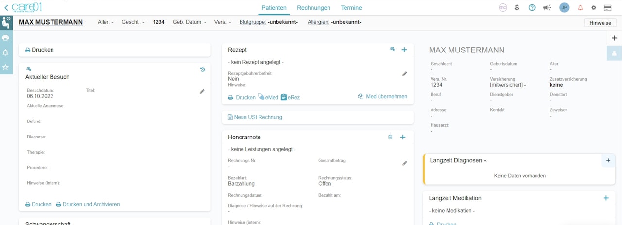 In der Besuchs-Ansicht verwalten und dokumentieren Sie die Besuche von Patienten in Ihrer Ordination. In dieser Ansicht können Sie Honorarnoten erstellen.