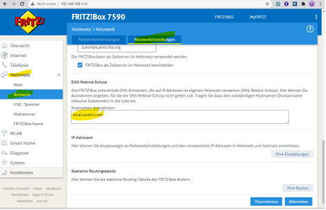 Falls Sie eine Fritz!Box als Internet-Router nutzen, loggen Sie sich bitte auf der Fritz!Box ein und tragen Sie local.care01.com als Ausnahme für den DNS-Rebind-Schutz ein (Heimnetz / Netzwerk / Netzwerkeinstellungen).