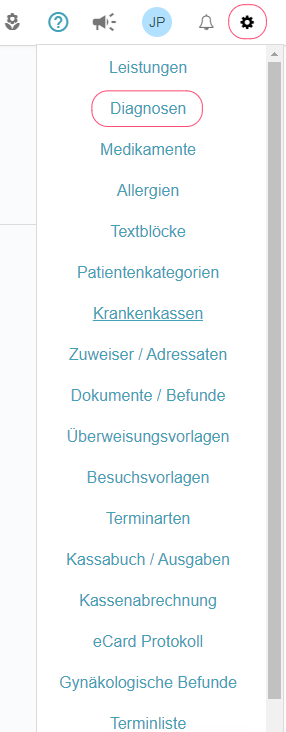Unter Einstellungen > Diagnosen können häufig genutzte Diagnosen angelegt werden. Diese erscheinen in unterschiedlichen Listen beim Patienten zur Auswahl.