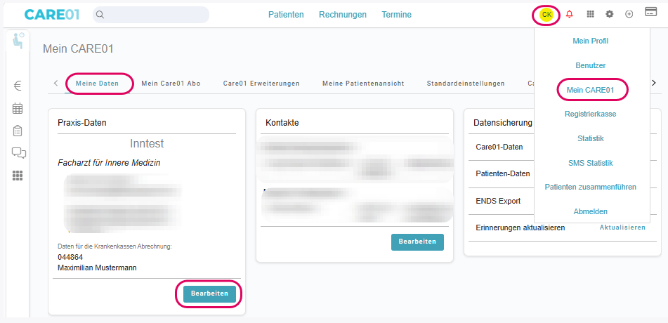 Geben Sie bitte unter Meine Daten Ihre Praxis-Daten ein. Als Kassenarzt oder Wahlarzt mit E-Card-Services hacken Sie auch "Ich habe einen Kassenvertrag" an und fügen dort Ihre Vertragspartnerdaten ein. Bei Adresscode geben Sie 00 (null null) ein, sofern kein andere bekannt ist.
