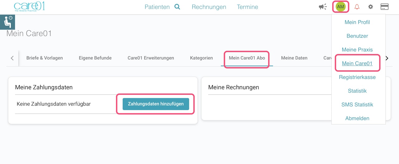 Unsere Rechnungen versenden wir Ihnen per E-Mail und hinterlegen Sie in CARE01 unter „Mein Care01“.