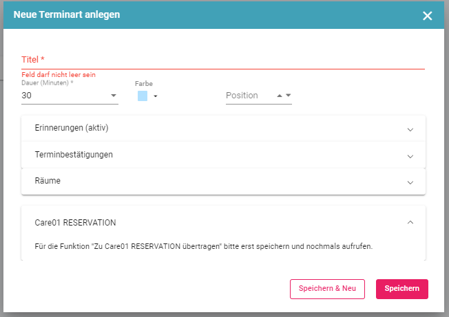 Klicken Sie Speichern, um die Terminart zu speichern und den Dialog zu schließen. Klicken Sie Speichern & Neu, um die Terminart zu speichern und eine neue Terminart anzulegen.